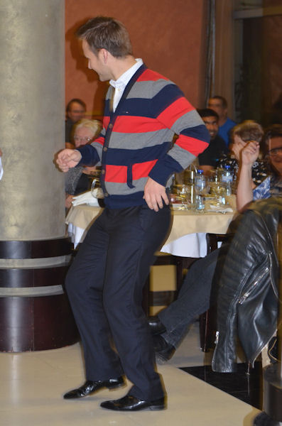 | Alternate Delegate for Germany, Gunter Berendt, with Lidia Anna Kosk from Poland. | Media Liaison Officer, Susan Dixon, discards her shoes and gets into serious dance mode | Alternate Delegate for Norway, Hans Christian Amlie, knows how to shake them hips! |